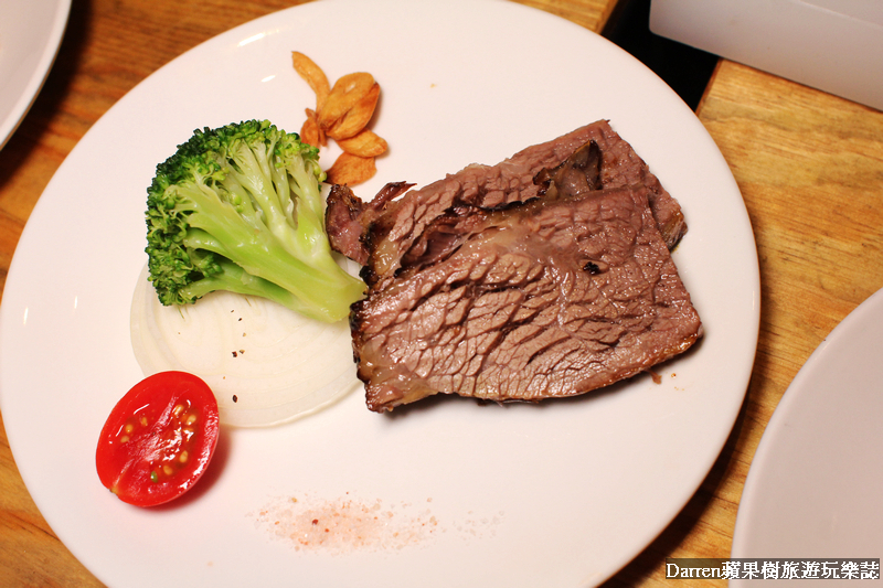 切好的牛排分盤後送上桌,牛小排旁邊有花椰菜蕃茄洋蔥和烤蒜片,牛排沾點玫瑰鹽帶點香甜肉汁和Q勁,就這樣又被我清盤了