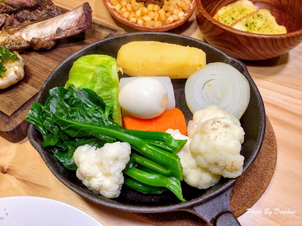全蔬食組合,卻讓我們一行人驚艷,嫩綠蔬菜、甜而綿密馬鈴薯與紅蘿蔔,加入橄欖油搭配著吃,光光滑油亮,氣味清香。