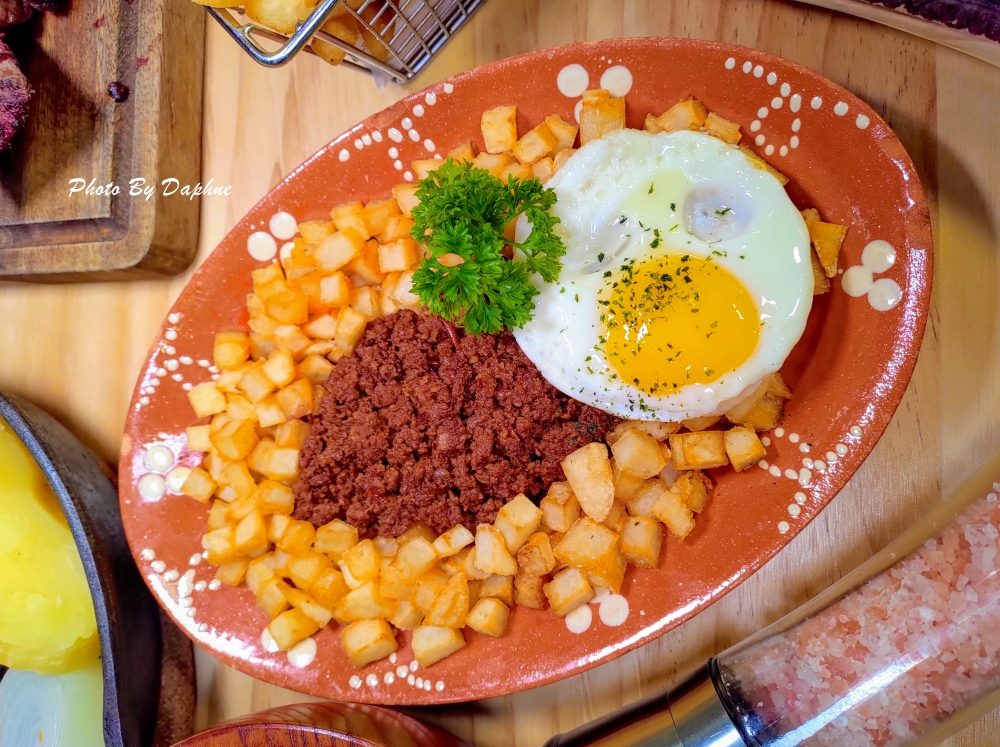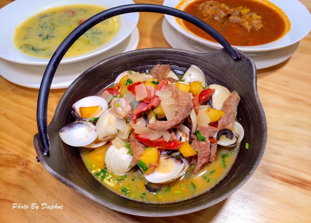 稍作變化的葡萄牙傳統菜。大致上的食材有:胡荽、香蒜、白酒、蜆肉。也會加入橄欖油烹煮,白酒讓蜆肉鮮味更突出,加入豬肉讓視覺上與愛吃肉的人都得到滿足,酒香撩人。