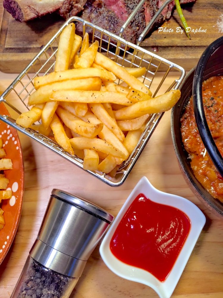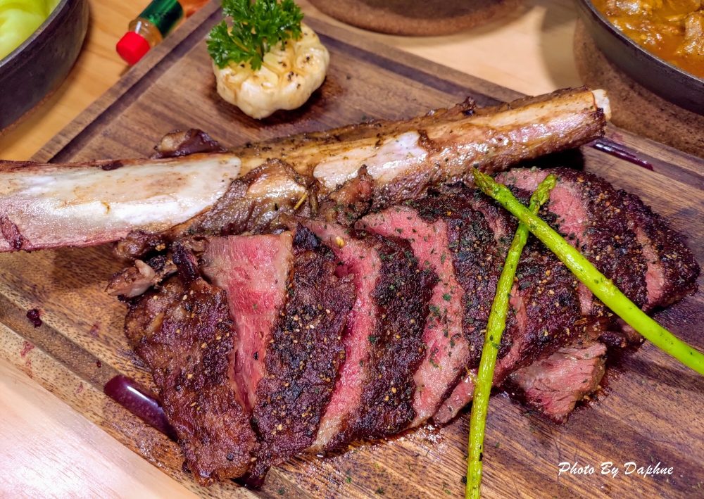 取自牛肋骨與肋骨之間的牛肉,牛肉大約烤到七分熟,外層焦香酥脆,切面呈現粉色,肉質Q軟有嚼勁,把肉下肚解決後,別忘了把骨條連接牛肉的軟筋膜一併解決。