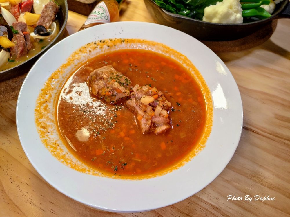 湯頭加入茄汁、番茄、紅蘿蔔、馬鈴薯、牛尾骨熬煮,甜味自然,湯質鮮滑爽口,像是羅宋湯,而牛尾肉質潤口充滿膠質,肉汁豐潤。