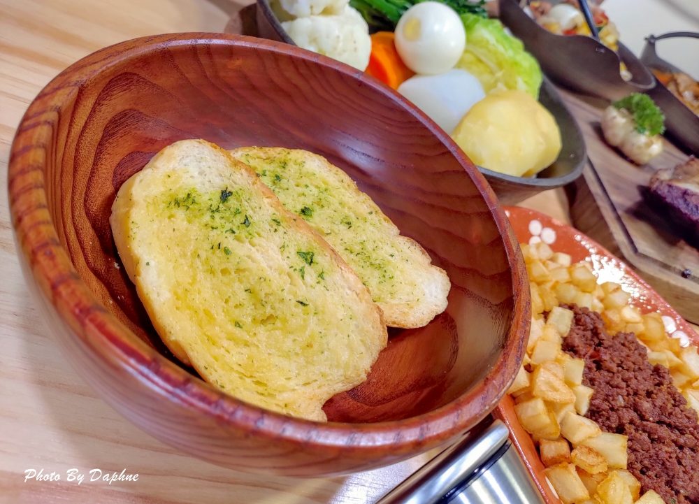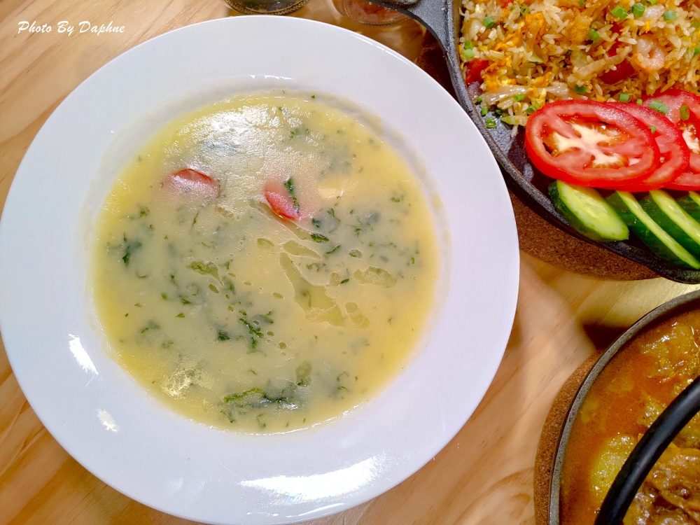 薯蓉就是薯泥,湯的食材除了有薯泥,也加入羽衣甘藍菜和葡國臘腸,煮湯後的羽衣甘藍菜比較沒苦味,葡國臘腸切片加入湯內調味,也擠出一些適度脂香,看似濃郁稠密,喝起來卻一點都不膩。