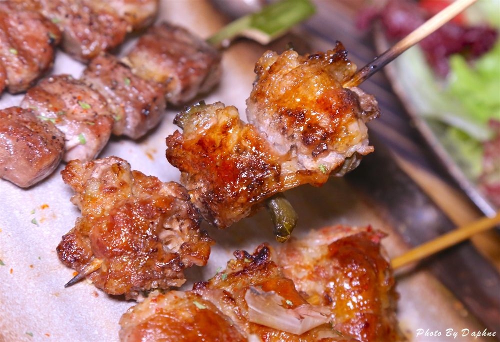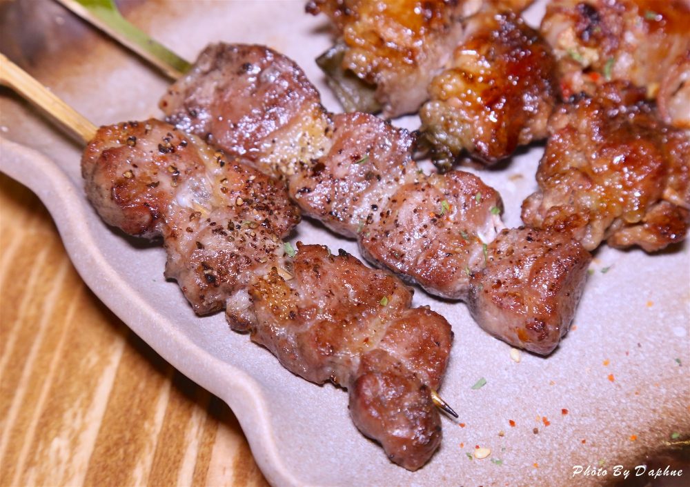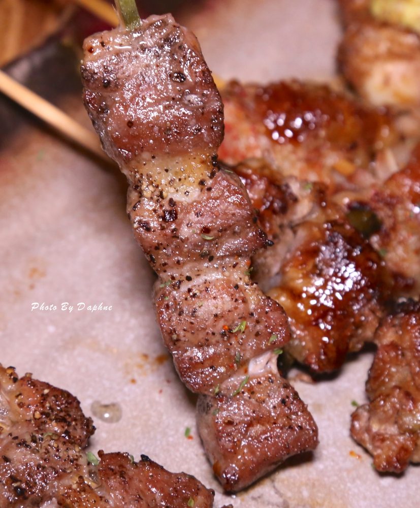 目視大約是五分熟不見血,一快肉搭配一片蒜片就很夠味。在燒烤過程中火侯掌握精準,沒有發生外部過焦與熟,內部還是過生的狀況,在嚼咬中油花與瘦肉相互推擠出肉汁,肉味在此時也最香。