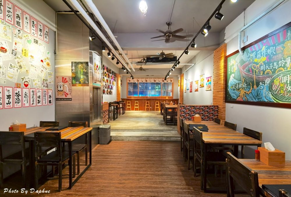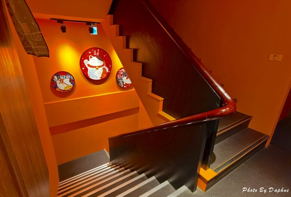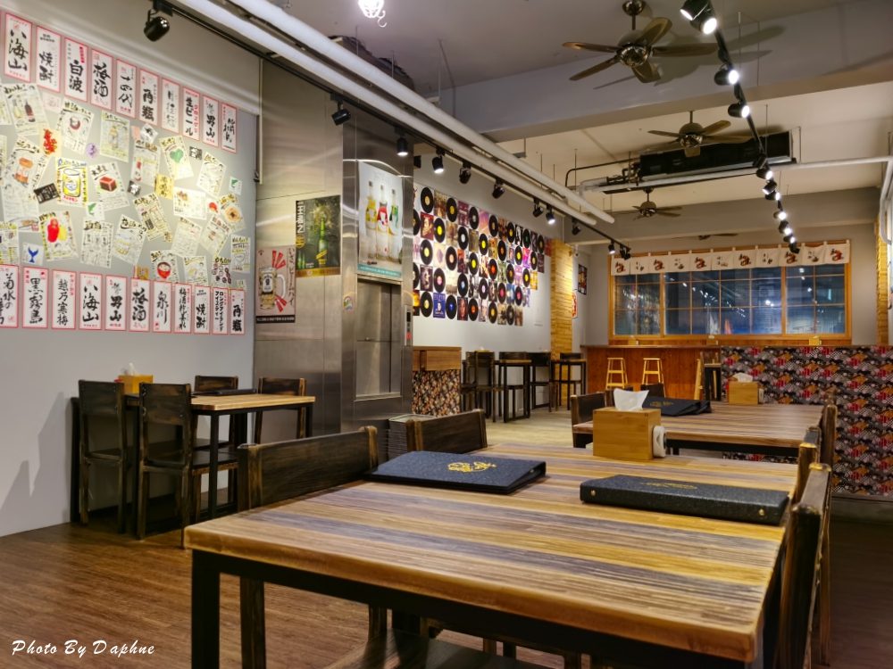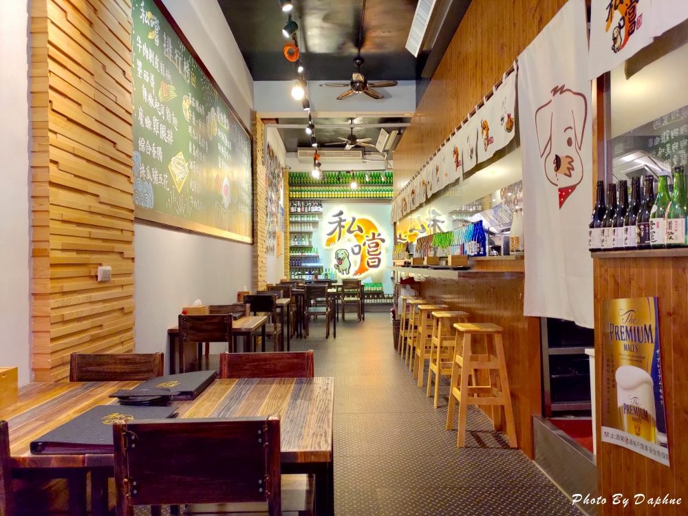 用餐區有一樓與二樓,雖然餐點是偏向日式居酒屋,但是店內員工很多都是熱愛毛孩的人,LOGO、布幔、標語總離不開狗,以及用到處收集或是購入的舊物、黑膠唱片做裝飾,比典型的日式居酒屋明亮,也注入一股台味。