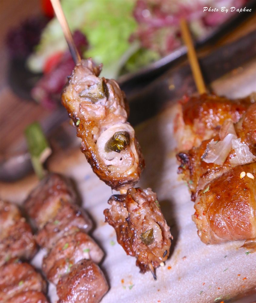 創店時即有的獨家料理,當年初訪新竹店就很喜歡。剝皮辣椒經處理並醃製醬料過後,不感苦澀並有醬香,同時辣度也很容易被接受,是很好的調味食材,無論煮湯或是當成串烤材料都很出色。被串在牛肉內燒烤,一整個搶味點睛,牛肉不必調味過重就好吃。
