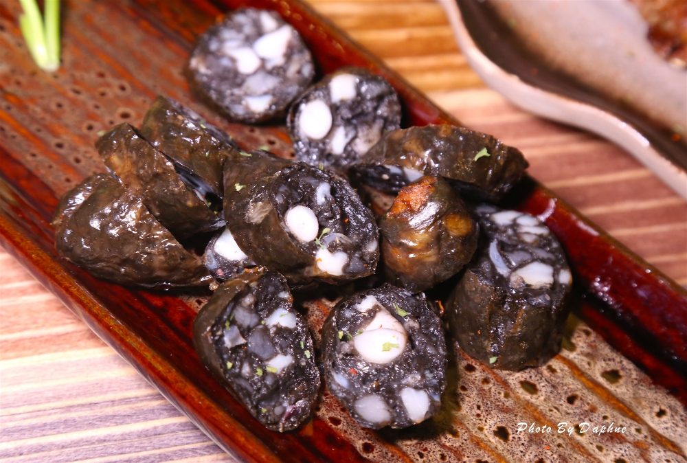 來自澎湖的墨魚汁與花枝製作成的香腸,花枝塊多,因此腸衣到整塊香腸都很有彈性,不油膩且脆中帶甜。另有售手工黑胡椒香腸與手工辣味香腸,想要三種都吃到就點綜合香腸。