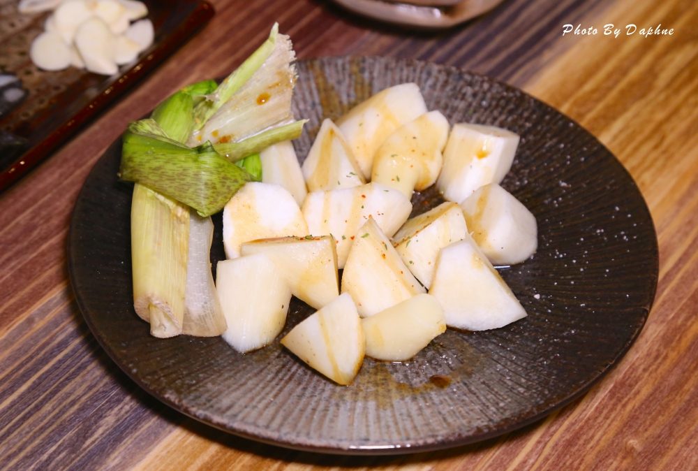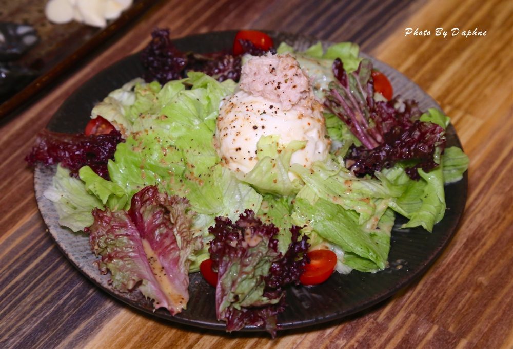 店家不但是處理燒烤的專家,在培訓員工時也將參觀水耕栽培蔬菜納入教育訓練,帶給客人新鮮健康的飲食。生菜、番茄、綿密鬆軟的馬鈴薯泥、鮪魚,淋上胡麻醬,涼爽添味。