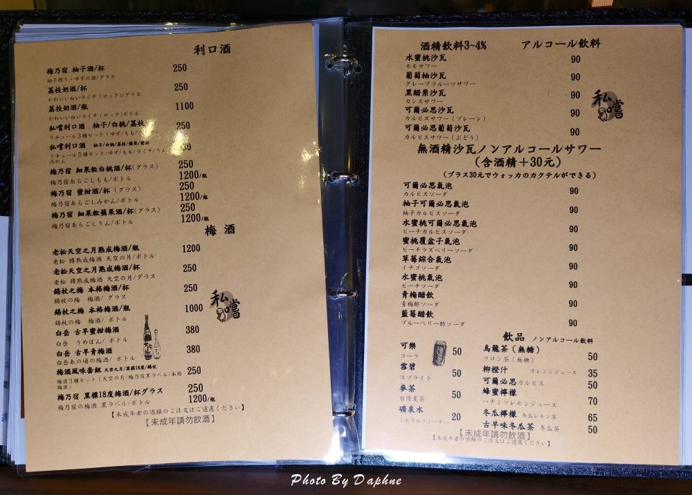 每人低消300元,酌收一成服務費,用餐時間限定兩小時。由於不少日本人會到私嚐用餐,甚至知名日本球員山口俊都有造訪過,因此菜單有日文同步標示。