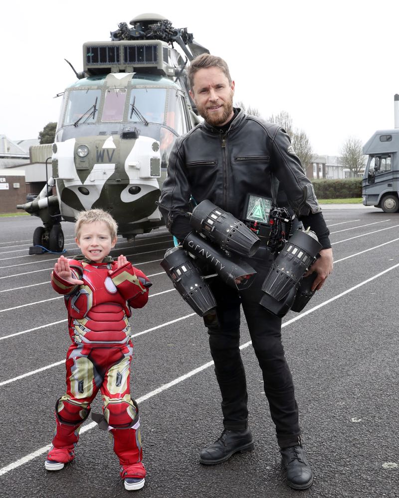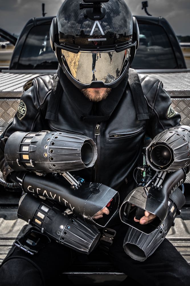 這組飛行套裝由英國科技新創 Gravity Industries Ltd. 所研發,由左右兩手與背部共 6 台主要噴氣推進式引擊、再加上裝載著飛行燃料的飛行背包,與內建抬頭顯示器的高科技安全帽所組成,其中安全帽裡還真的能顯示所剩燃料與飛行安全等相關資訊,儼然就是鋼鐵人的視野!