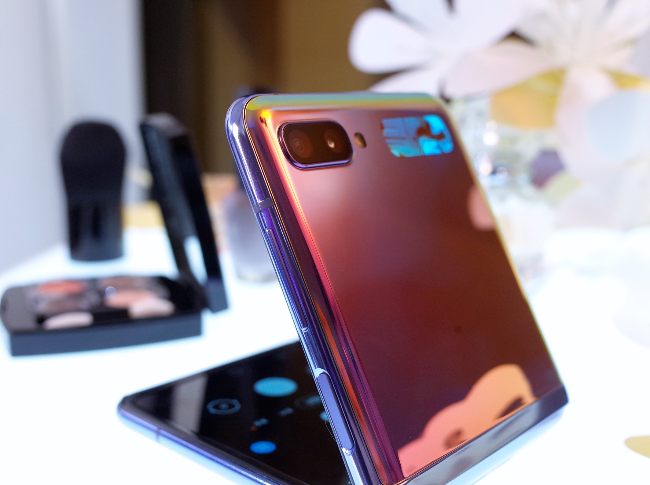 Galaxy Z Flip 是三星第二部摺疊手機,折疊方式類似粉餅盒上下開闔的設計,因有了先前 Galaxy Fold 經驗,三星這次針對轉軸結構、螢幕進行明顯的加強。也因為採上下凹折的關系,下半部機身能化身為「螢幕底座」(你要叫腳架也可以),能夠以免手持的方式進行視訊、團體合照。