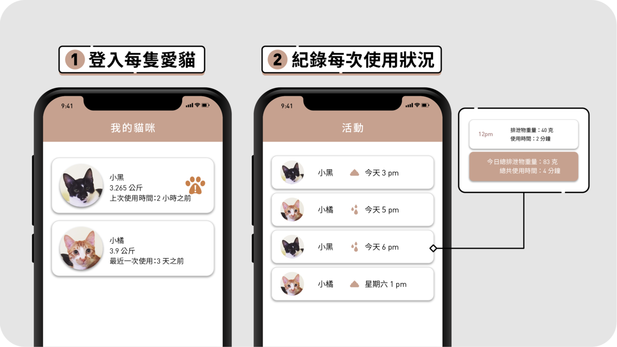 如果家裡有兩隻以上貓咪的話,還能夠藉由貓咪臉部、毛色、體重綜合性來判斷出貓咪的身份,並記錄自己的健康狀況。