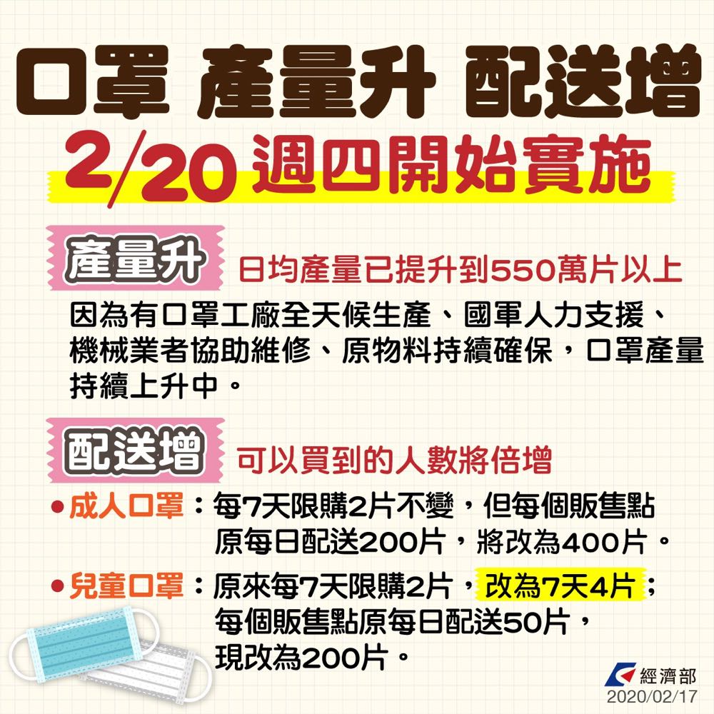 也配合調整,將從今天 (20 日) 起成人口罩維持每 7 天限購 2 片,但每個販售點原每日配送 200 片,改為 400 片;兒童口罩則是從原本的每 7 天限購 2 片,改為 7 天 4 片,每個販售點本來每天配送 50 片,也會改為 200 片,讓可以買到的人數能夠倍增!