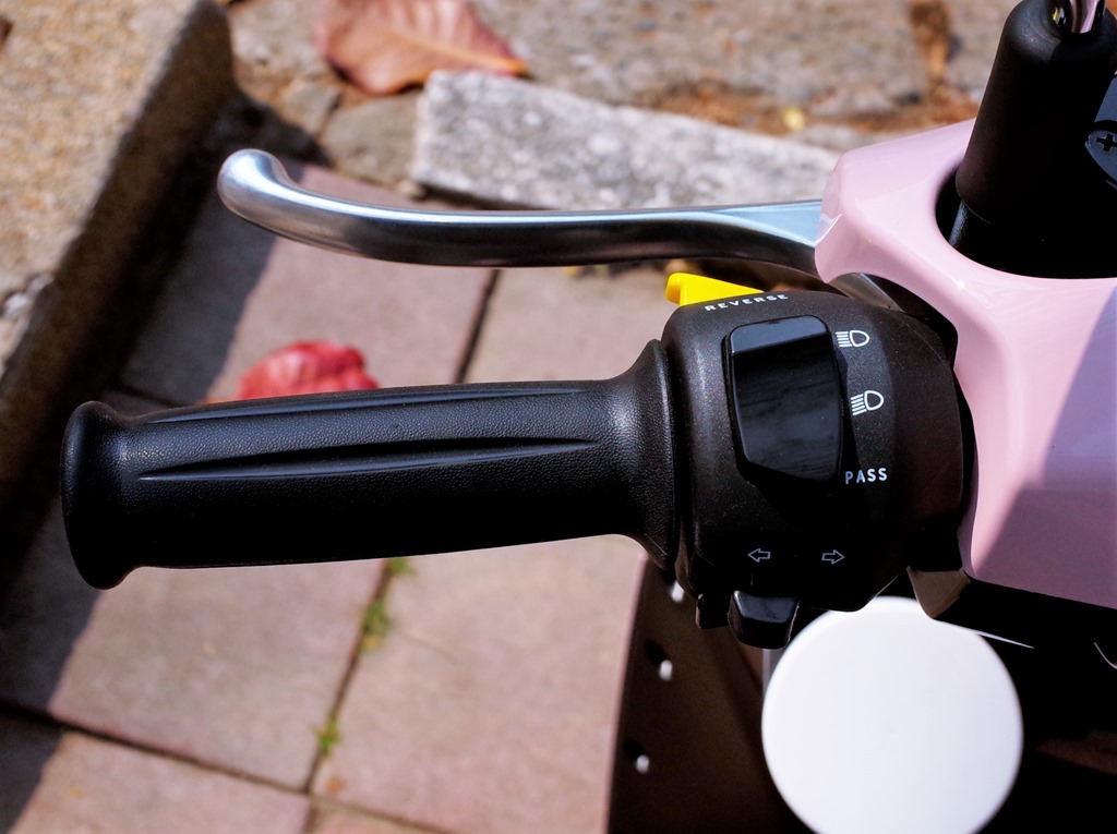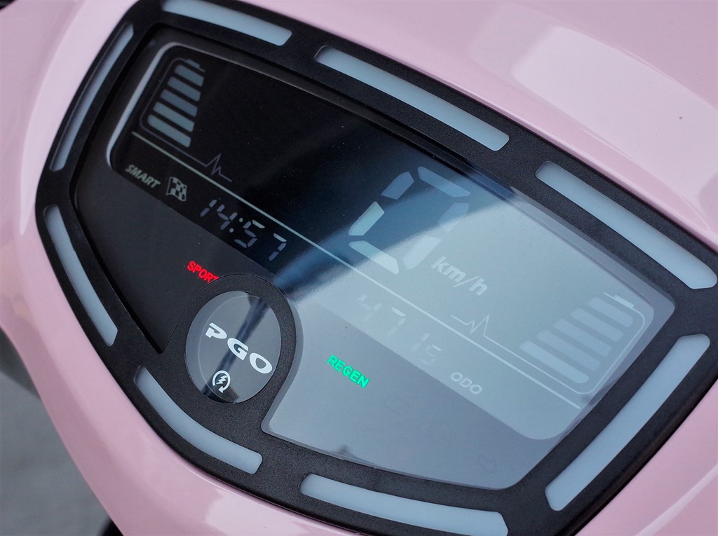 操作按鈕和儀表方面,左方把手上有基本的前車燈、方向燈外,還提供示意對車的 PASS 燈鍵以及倒車輔助鍵;右方把手由上依序臨停燈、車廂開啟鍵盤,TRIP 鍵可讓儀表顯示行駛里程(可重置)、電池續航里程,最下方的 SMART 鍵則是能切換省電 SMART 模式或提升動力的方格旗模式(需購買性能方案)。