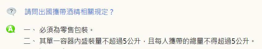 *補充說明:那烈酒可以帶嗎?可以!必須要為零售包裝,也就是包裝完成不能打開的,另外單一容器內盛裝量不超過5公升,且每人攜帶的總量不得超過5公升。如果回台灣出海關,一公升內免申報,一到五公升要申報,也就是行李檢查處要走紅線。