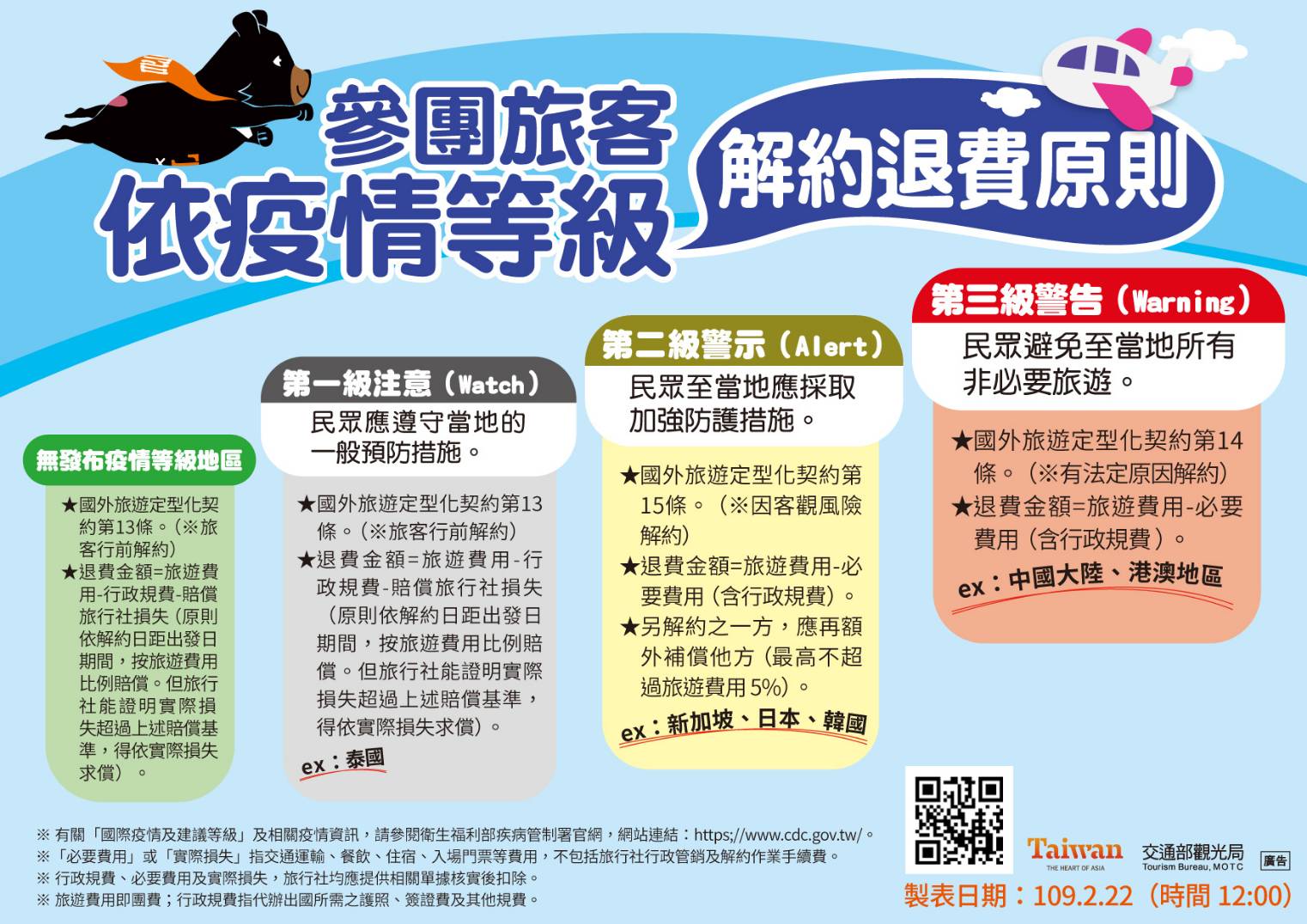 根據交通部觀光局表示,如果是前往的國家,被列為第三級:警告 範圍,那麼旅行團將會扣除必要費用外,全額退費;若是第二級: 警示(新加坡、韓國、日本) ,除了扣除必要費用外,再扣掉 5% 團費