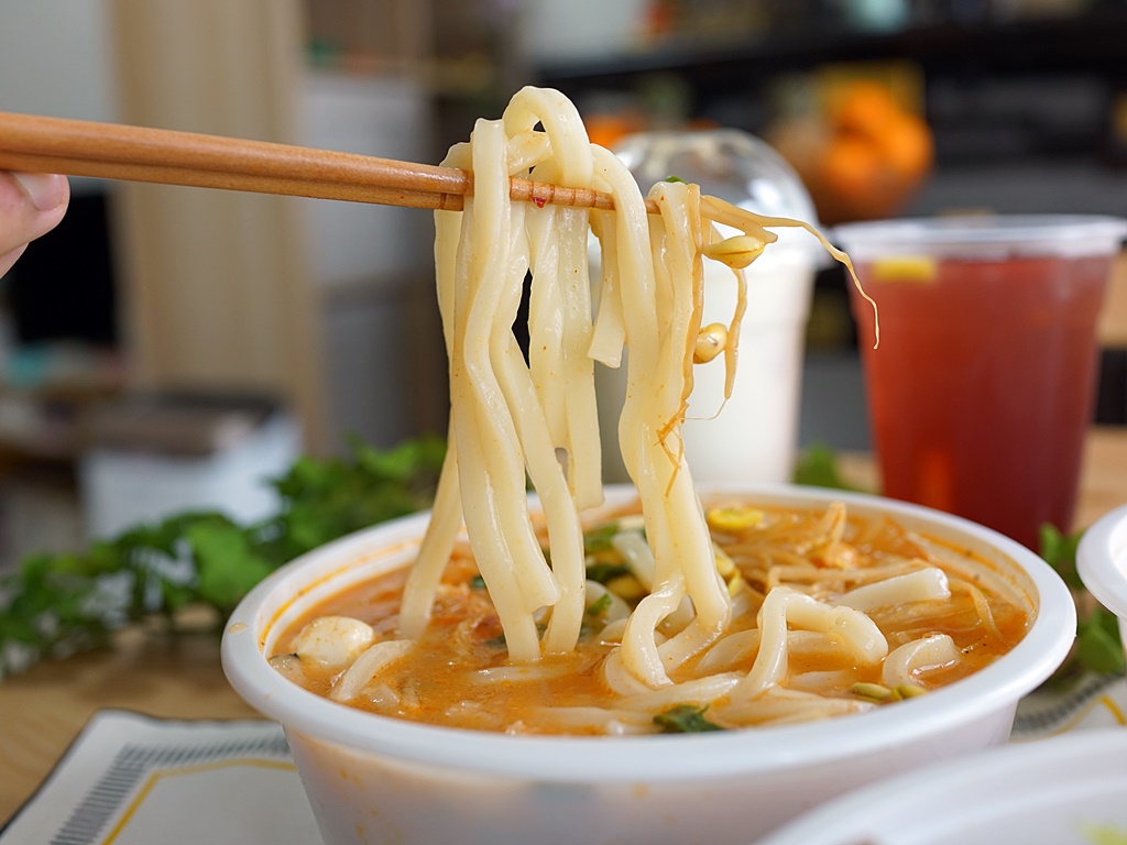 同樣包含手搖飲料一杯、醃蘿蔔一份!這道我蠻喜歡的,烏龍麵的部分是選用南橋烏龍麵,口感Q彈,湯底加了泡菜,喝起來酸酸辣辣的很帶勁,讓人忍不住一口接一口,烏龍麵是有主食的,可以選牛肉跟豬肉,一份大約會有兩三片肉,還有一顆半熟蛋,我覺得比嫩豆腐煲還要有飽足感。