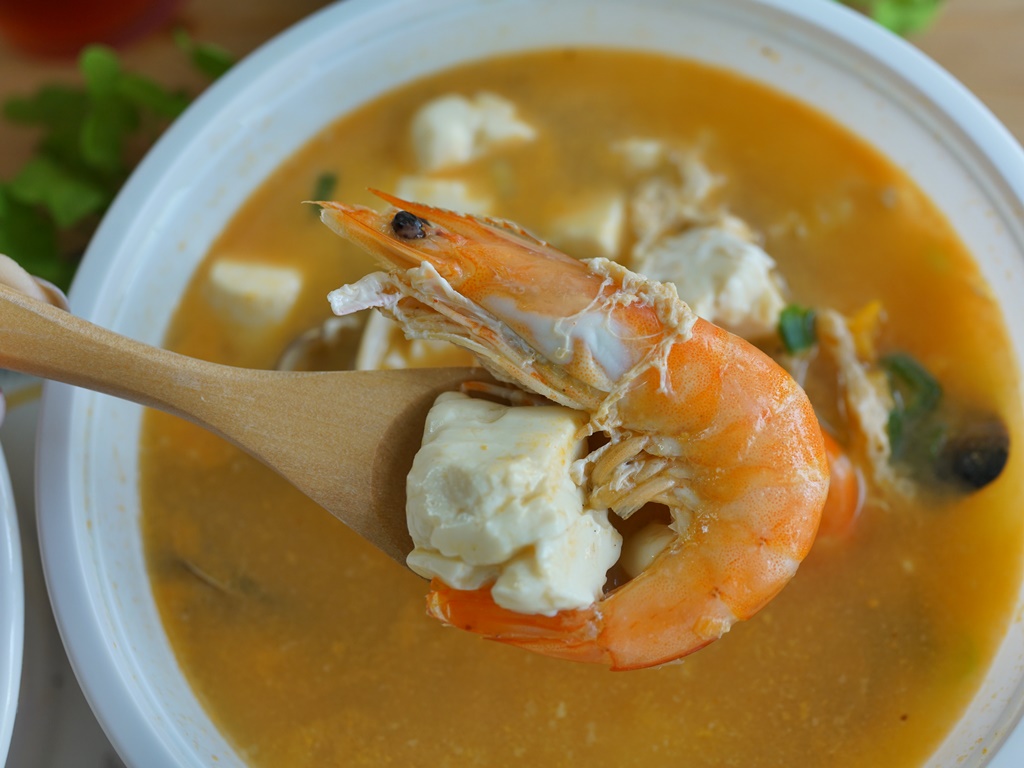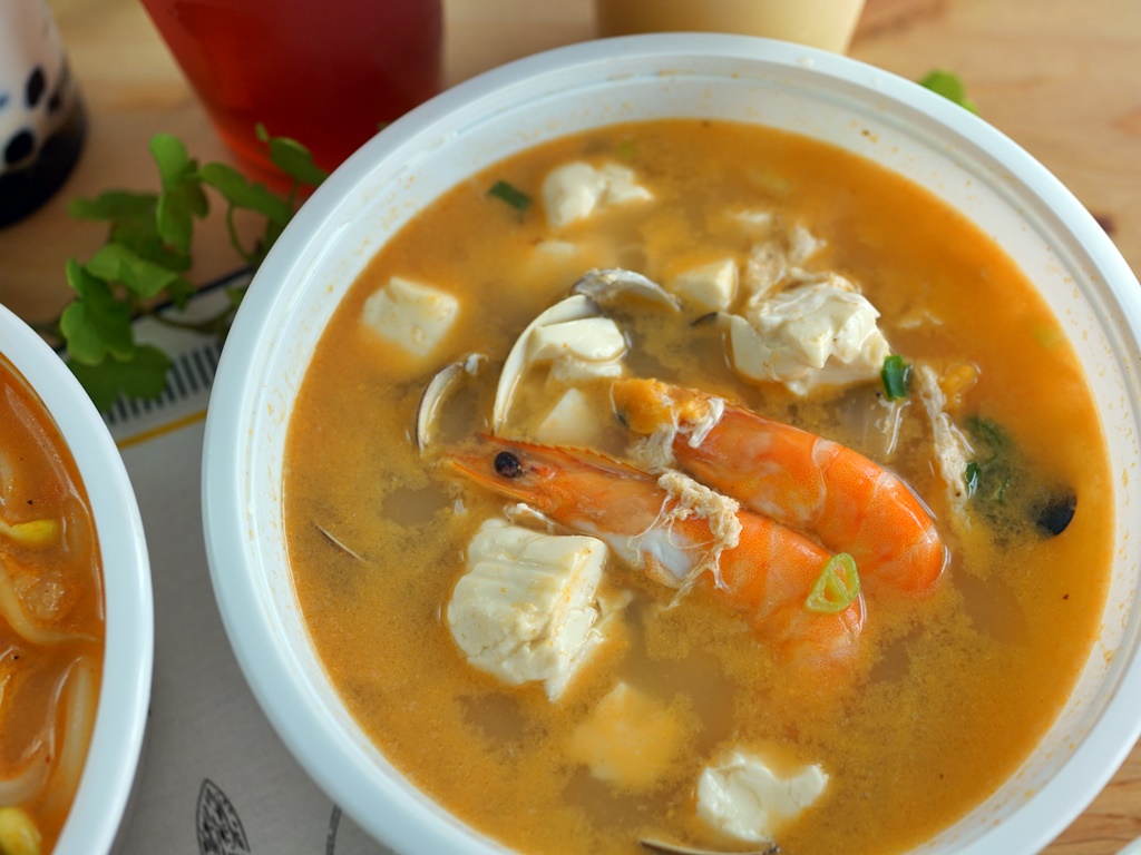 包含嫩豆腐煲一份、白飯一碗、手搖飲品一杯、醃蘿蔔一份,雖然價格偏貴,但吃喝一次滿足還蠻超值的,因為不是附送小小一杯紅茶之類的,而是真材實料的手搖飲唷!餐點部分,我點的海鮮綜合裡面有蝦子跟蛤蠣,吃起來新鮮度都夠,蛤蠣肉是飽滿的,加上嫩嫩的豆腐、微辣的湯底,整體味道很下飯~美中不足的是份量偏少,如果再增加一些別的配料會更吸引人。