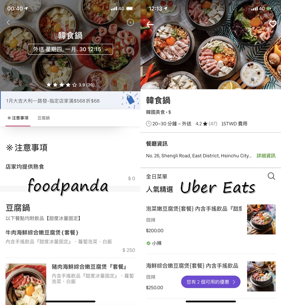 韓食鍋在 Uber Eats 和 foodpanda 都有提供外送服務,兩個平台的菜單相同,餐點價位落在200-250元之間,價差可能就在於平台本身的優惠或運費的不同,大家可依個人喜好選擇慣用的平台。