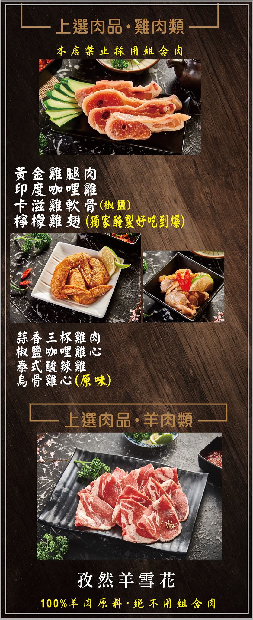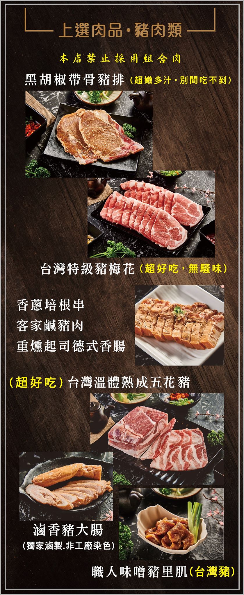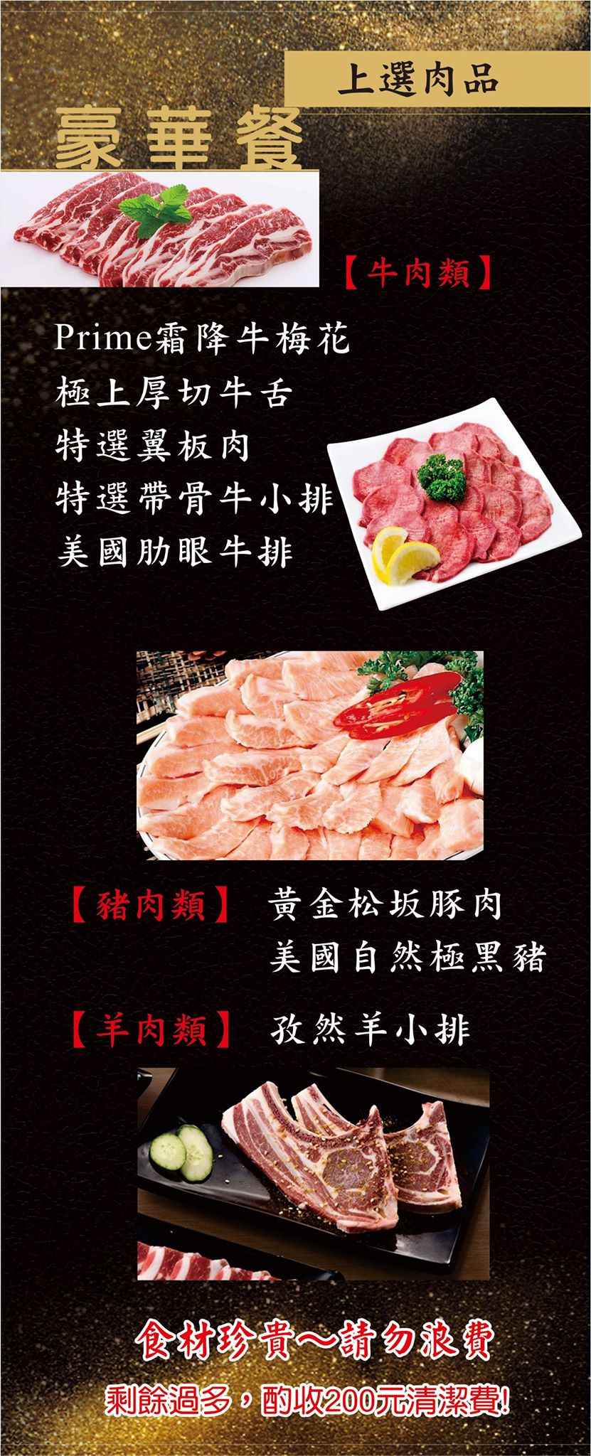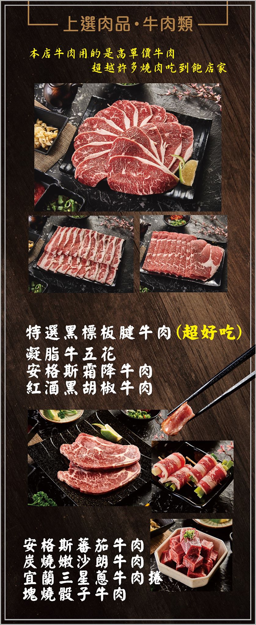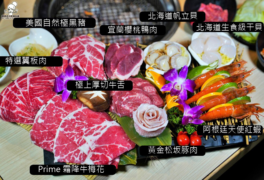 Prime 霜降牛梅花、極上厚切牛舌、特選翼板肉、黃金松坂豚肉、美國自然極黑豬、宜蘭櫻桃鴨肉、