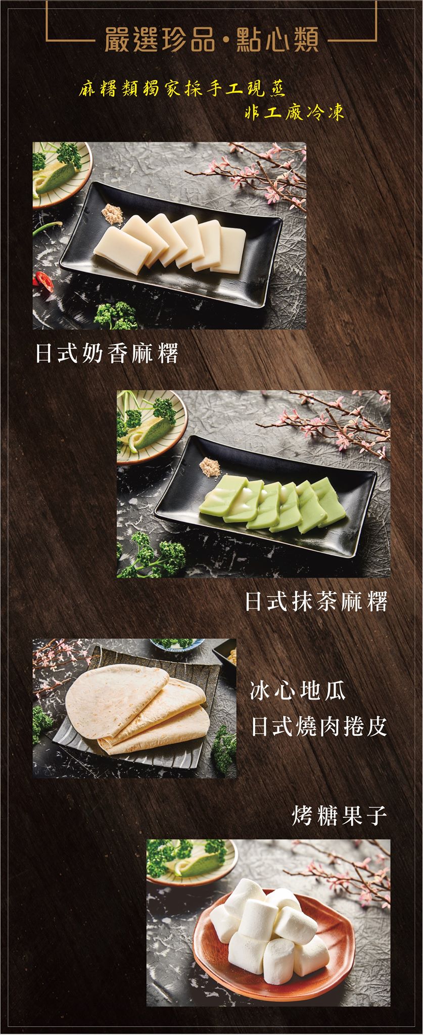 日式奶香麻糬、日式抹茶麻糬、日式燒肉捲皮、烤糖果子、巧克力布朗尼