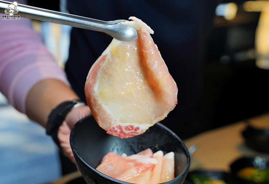 台灣溫體熟成五花豬顏色比較深層,口感很扎實帶有豬肉甜味,單吃或者用美生菜包著吃都很好吃唷!