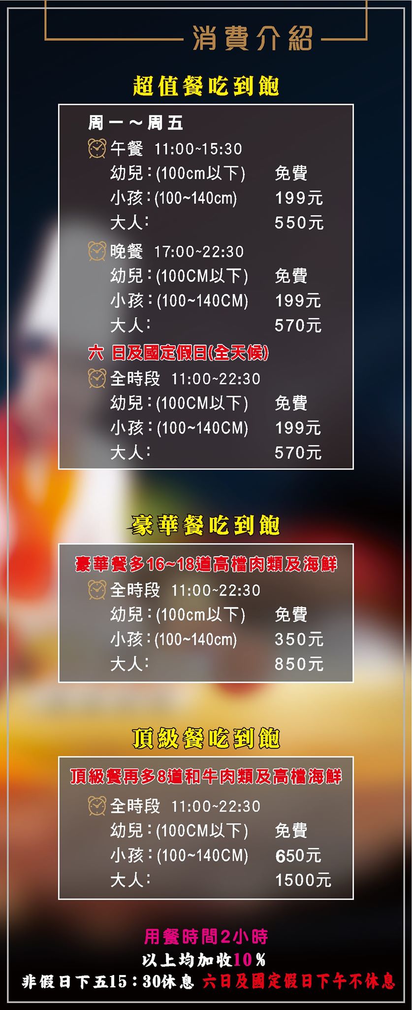 分三種收費模式:超值餐吃到飽、豪華餐吃到飽、頂級餐吃到飽