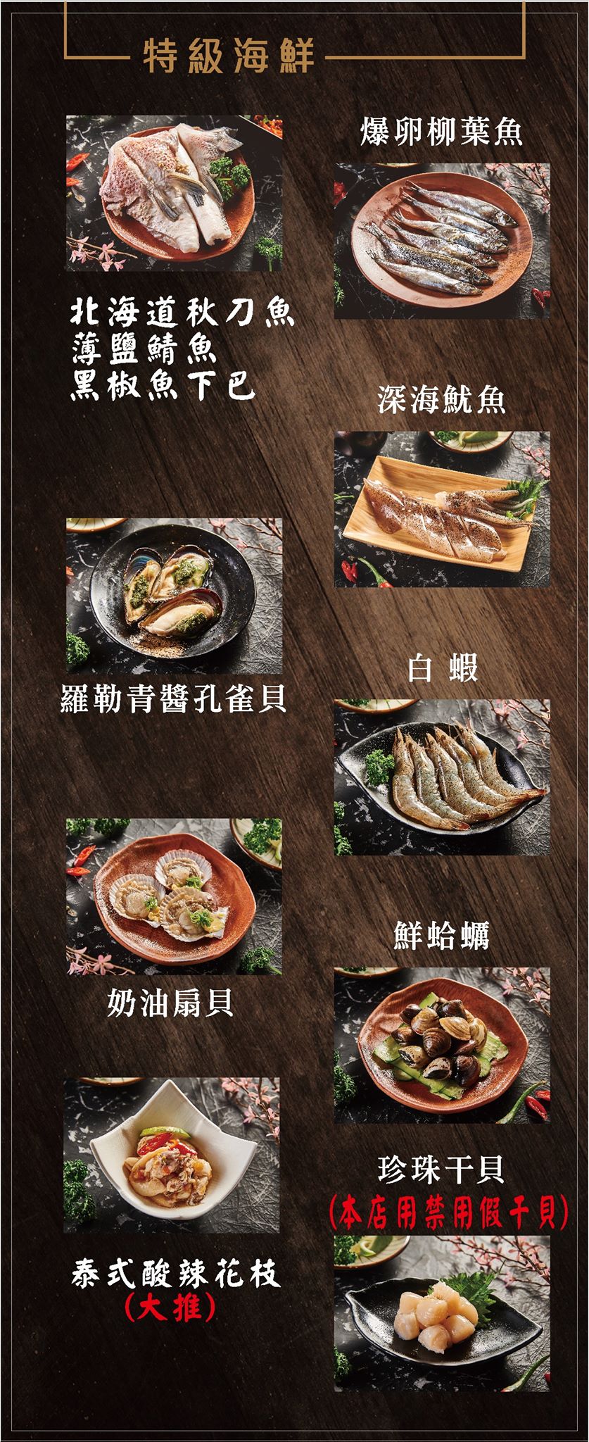 阿根廷深海魷魚、特選帶骨牛小排、美國肋眼牛排、孜然羊小排