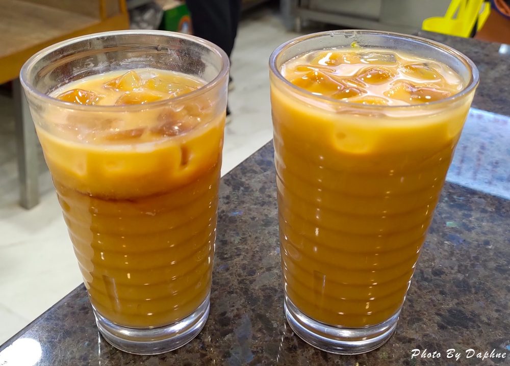 桌上備有糖包可以自己添加,但 Daphne 覺得不要多加糖,比較有茶香,這裡的奶茶屬於茶香重,奶味中等。雖然泰式奶茶也是茶香偏重,不過甜度更高,奶味也濃。想要省錢,可以直接喝店家提供的涼茶。