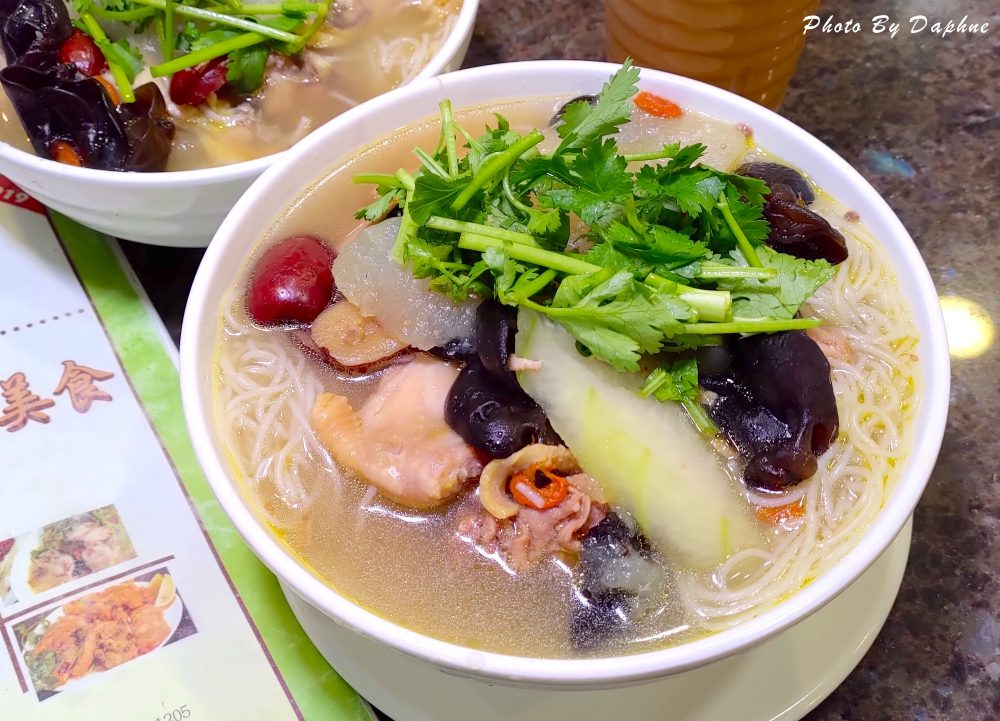 餐如其名,不愧是店家招牌。但是不喜歡吃香菜的人,可以先跟點餐人員告知不要放,只是很可惜,加香菜才會好吃呀!湯頭看起來浮上一層油,但是喝起來很清爽,像是藥燉的雞湯,有淡淡的藥膳香氣跟酒味,加入冬瓜、枸杞、紅棗、雞肉熬製,為湯頭帶來清香與甜度,完全不會感覺在喝純中藥湯,份量很實在。