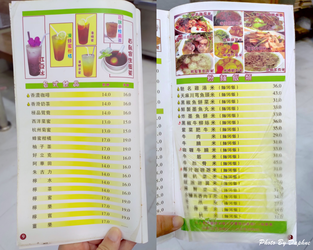 大部分的主食,雖然上面寫「米」但都可以更換成麵、河、飯,飲品14MOP起,主食價位換算成台幣也才一百多元。只拍部分菜單內容,大致上有粥品類、麵包、多士、特色小菜…等。當吃過澳門飯店內的餐廳,看到榮暉咖啡美食菜單的價位,會感動到要哭。