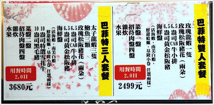 ▼另外也有推出巴菲特雙人、三人套餐,用餐時間同樣是2小時,也很適合小型的宴客或是犒賞自己、另一半及閨密好友! P.S.店家提醒(餐廳追求最高品質,部份食材都是當天採購),建議套餐提前預約才不會撲空喔!