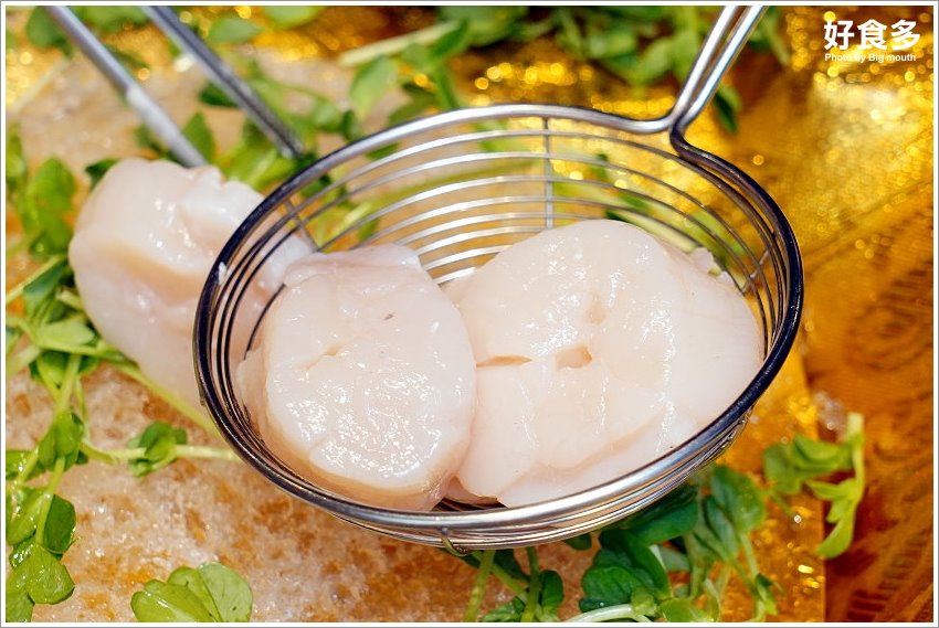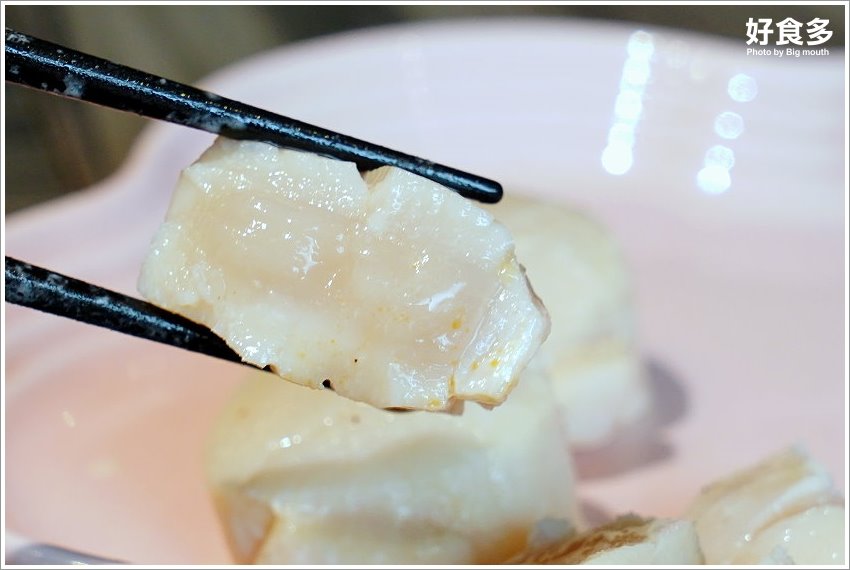 ▼干貝也差不多煮個兩分鐘即可,就能吃到外熟內嫩的絕妙口感;考量到當天有女孩兒,服務人員還貼心將干貝對半分切比較方便享用!一口咬下,不僅鮮甜香嫩,而且甜度都緊緊鎖在裡頭,一整個好銷魂的美味!
