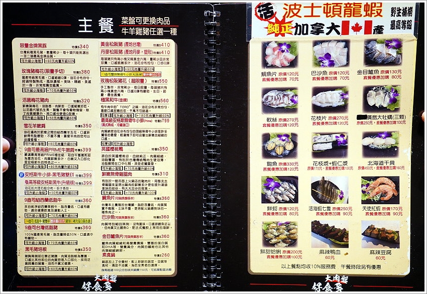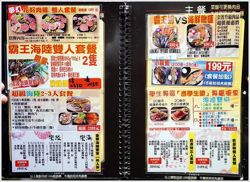▼登愣!這就是店家最新推出的豪華海陸饗宴(四人份),也是我們這次享用的餐點!裡頭的餐點密密麻麻一長串,大致上就是海陸全餐,很適合一家大小、三五好友或是宴客專用,而且用餐時間還可以延長到2小時,不管是請客或是自己享用都很速西啊! P.S.店家提醒(餐廳追求最高品質,部份食材都是當天採購),建議套餐提前預約才不會撲空喔!