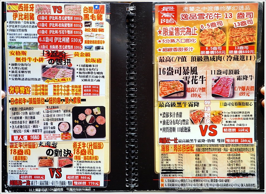 ▼13盎司的肉品有多大盤,看這張圖應該很明白了吧(笑)~~而且提供的還是高品質的安格斯牛小排、伊比利梅花豬,一整個份量十足!