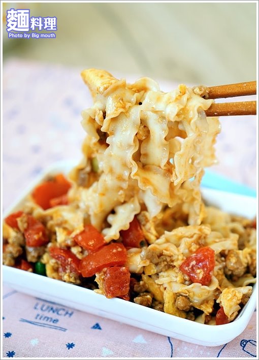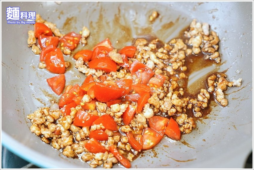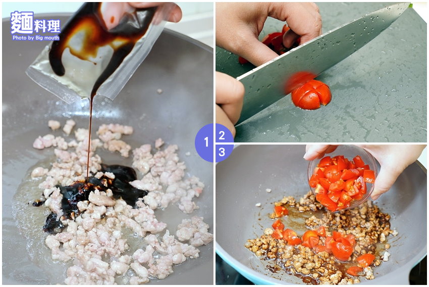 1.先將豬絞肉炒熟,再加入獨家醬料包,接著放入切丁的小番茄一起炒香,炒熟後先撈起放至一旁!同時也可以先燙意麵,燙熟後撈起備用!
