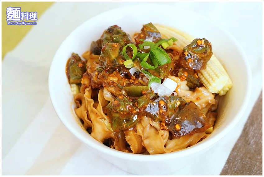 ▼最後將醬料淋上意麵,再擺上玉米筍、蔥花就大功告成啦~是不是超級簡單,簡單到都不好意思寫了!
