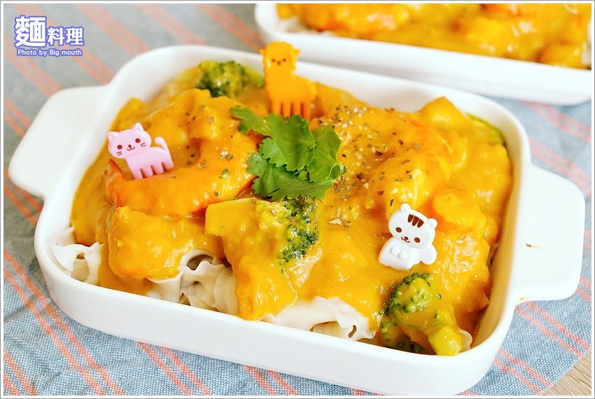 ▼另外一道鮮蝦南瓜麵也是非常受小朋友喜愛,尤其甜甜的南瓜泥好看又好吃,搭配蝦子剛剛好啊!大口先將食材與做法簡單整理如下: