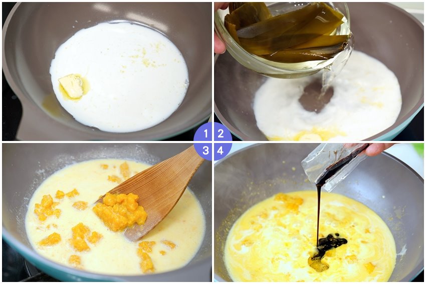 3.依序倒入奶油、牛奶、昆布高湯、南瓜泥等,再加入獨家醬料包