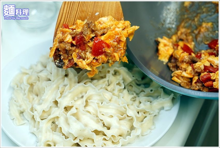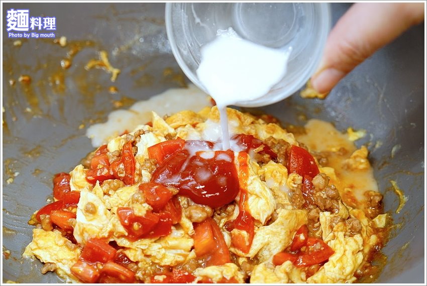 ▼蛋花要滑嫩才好吃,兩顆蛋打散後加入些微的鹽巴、橄欖油及少許的水,倒入鍋中不時的翻攪,就會有種滑嫩蓬鬆的感覺!趁蛋花還沒有全熟的時候,再倒入剛剛的番茄肉燥,這樣蛋花才不會過老唷!