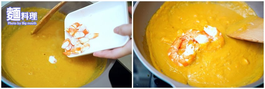 ▼南瓜醬煮得差不多之後,再放入花椰菜、蝦仁拌煮一下即可!