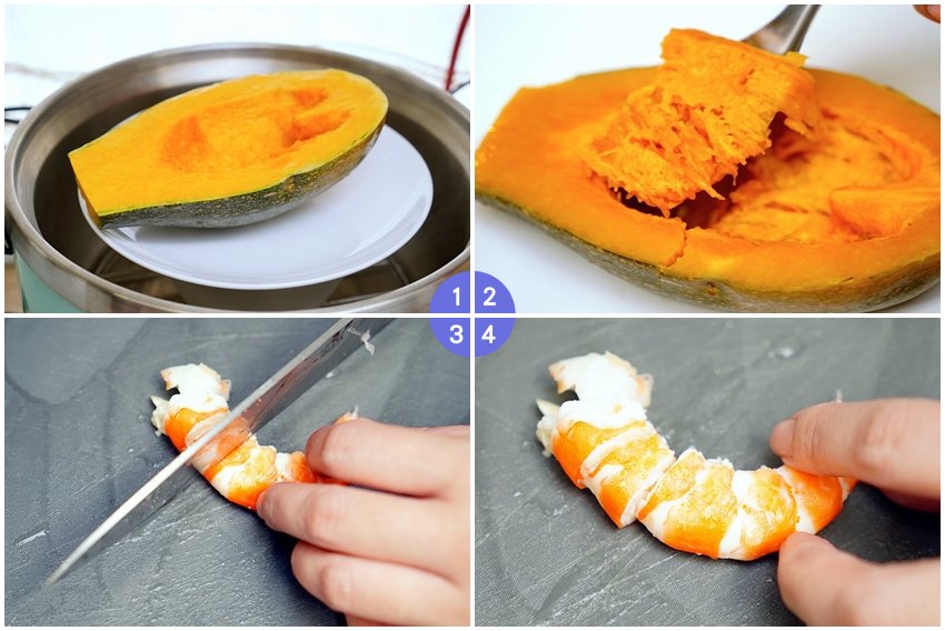 1.南瓜洗淨,將籽去除後用電鍋蒸熟,就可以用湯匙取出南瓜並搗成泥狀