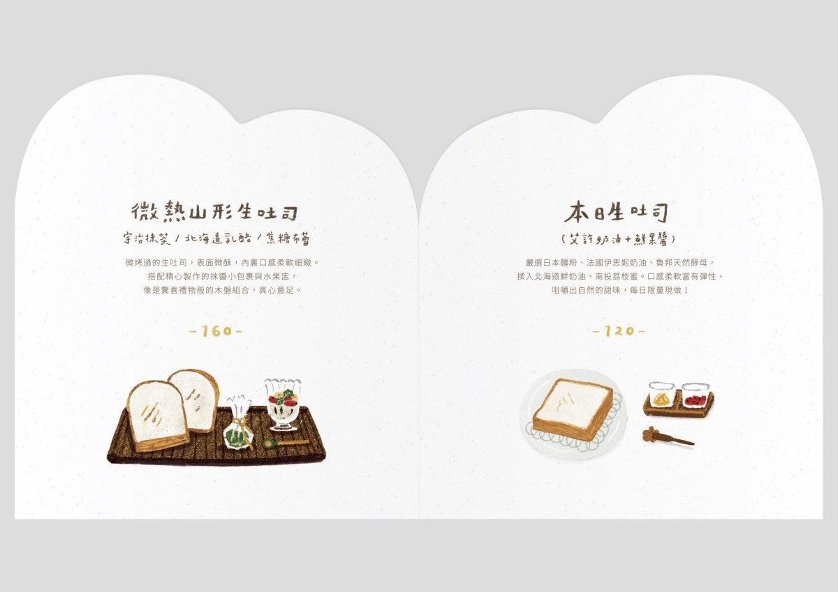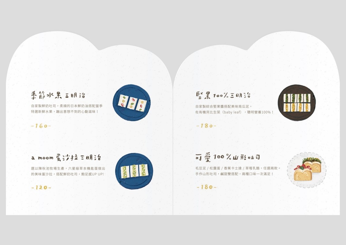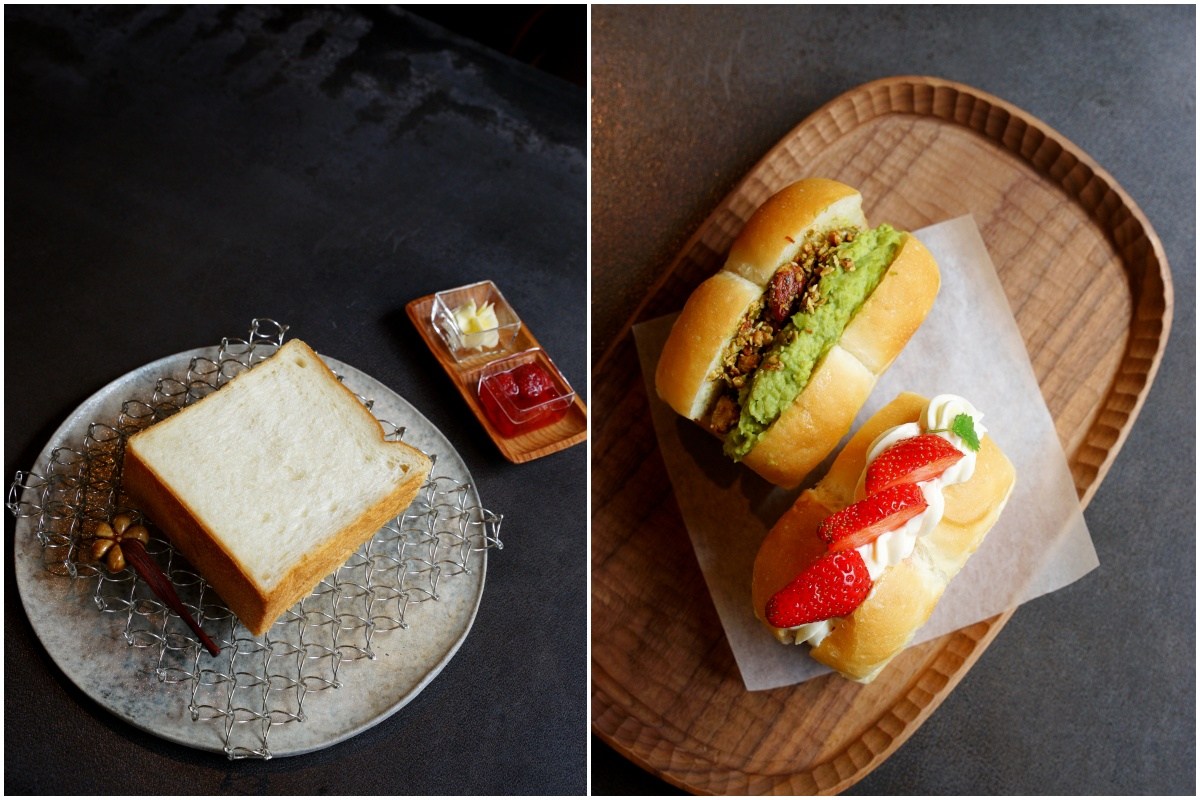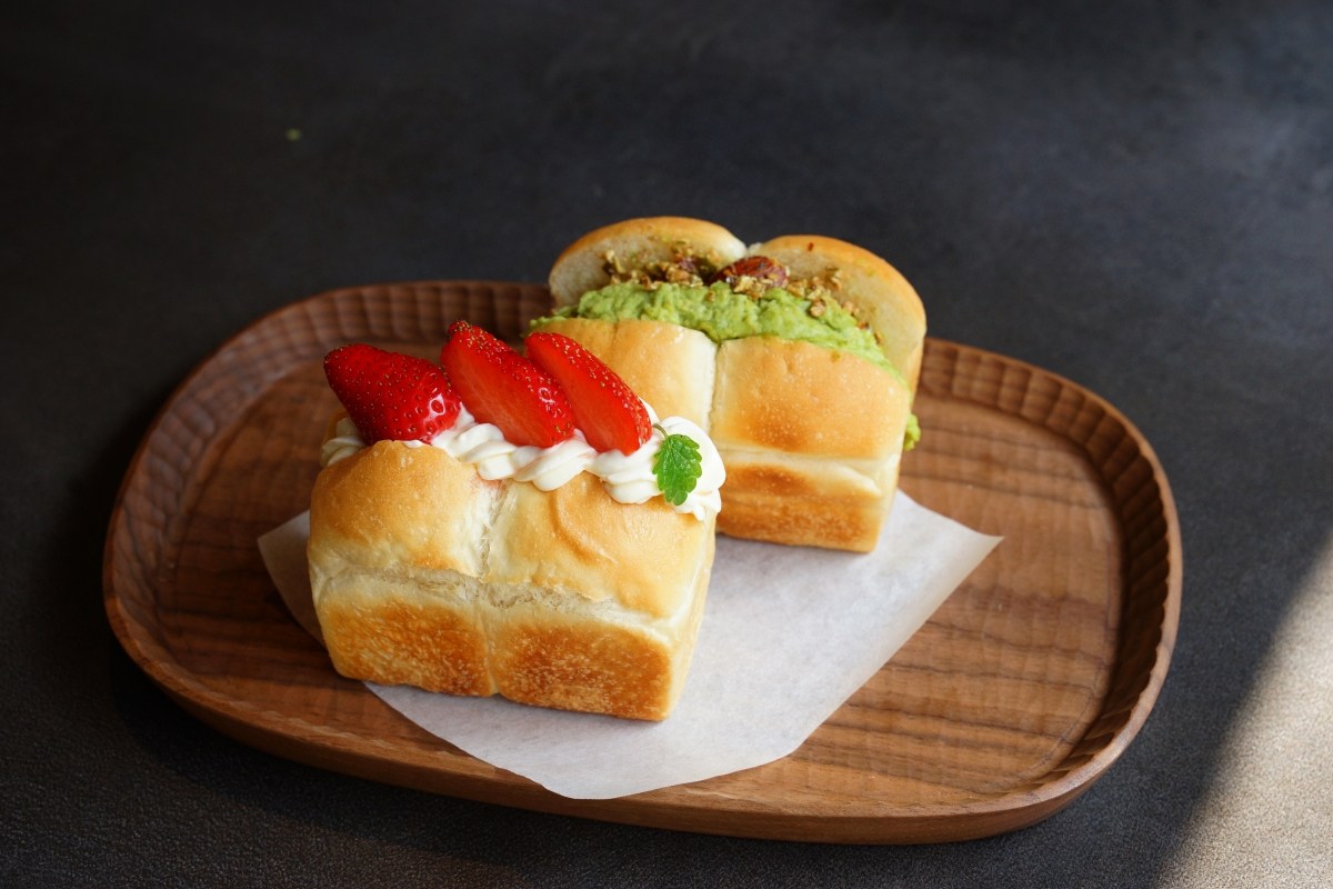 三明治、山形吐司、生吐司三種不同的作法,搭配不同口味選擇。蛋沙拉三明治是許多人推薦的餐點,但我們這次沒有點。選了生吐司和山形吐司。可愛山形吐司口味四選二,還蠻特別的有毛豆泥、松露蛋、香蕉卡士達、草莓乳酪。