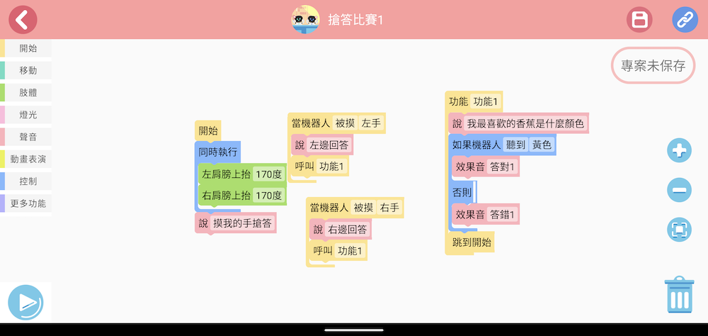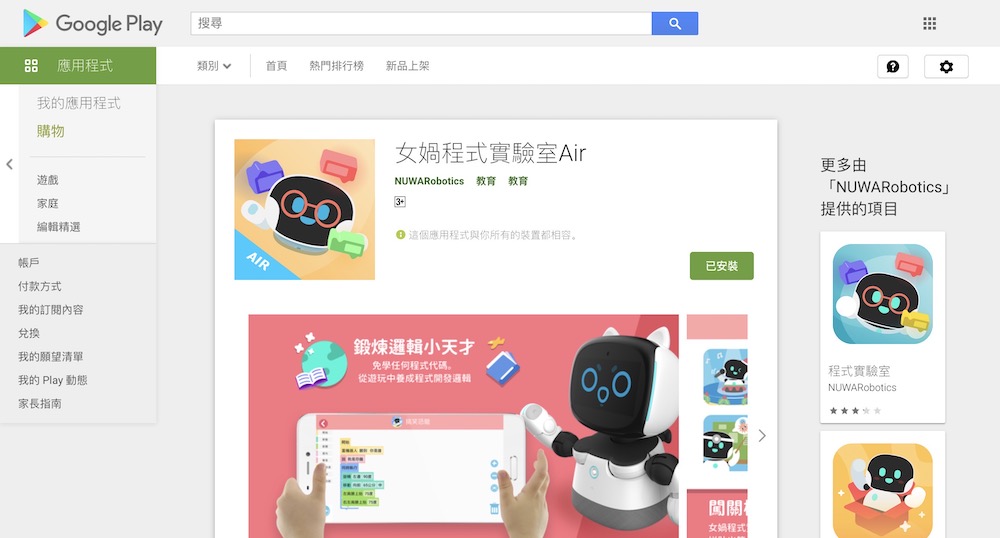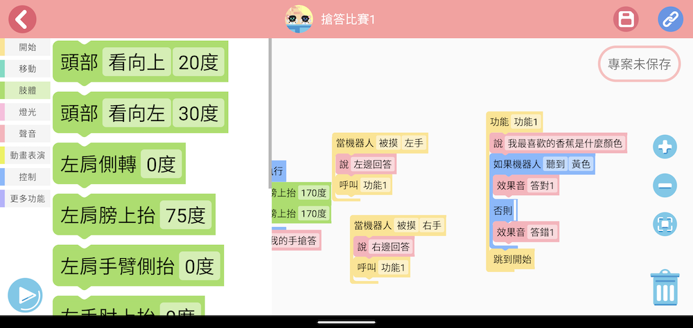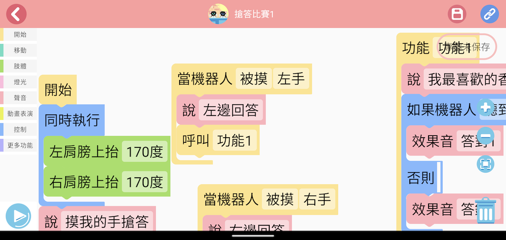 要開始編寫程式前,可以到 Google Play 商店或 App Store 下載「女媧程式實驗室 Air App」,連線後就能開始編寫程式。值得一提的是,可編寫的內容非常豐富,除了基本的移動距離外,更深入的對話內容、肢體動作、燈光效果也都可以編寫,培養孩子邏輯和除錯能力。