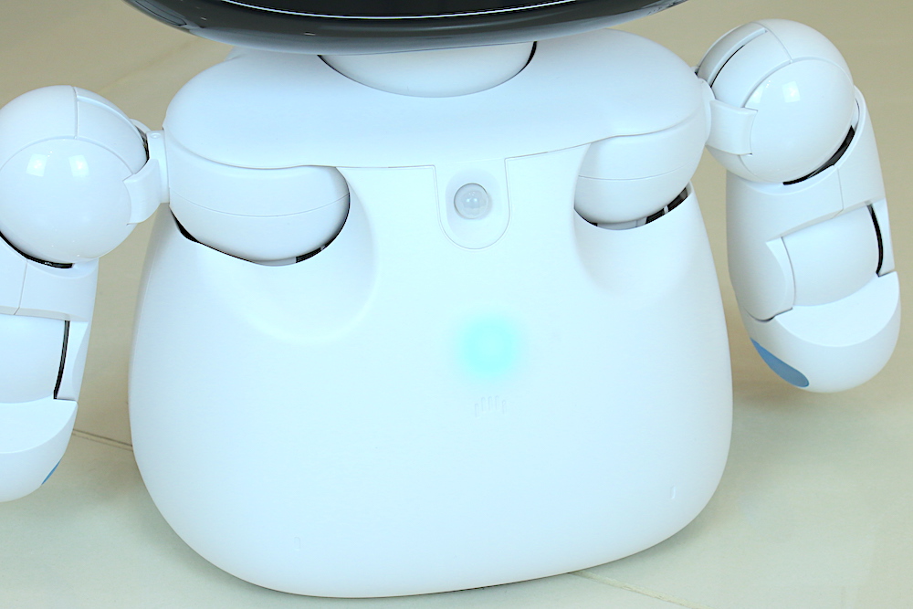 身體正面整合了三個重要元件,由上至下分別是可精準偵測使用者位置的 PIR 感應器、可顯示目前運行狀態的狀態指示燈,以及與前面兩個觸摸區一樣,摸了會有對應的反應與表情的肚子觸摸區。