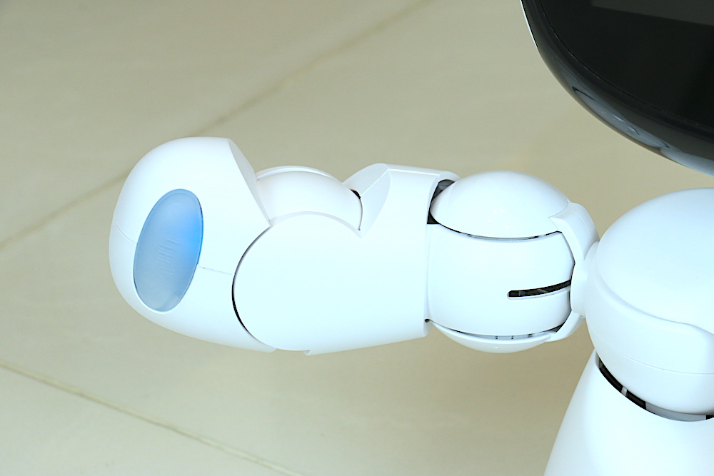 雙手是由多個馬達、關節組成,可動範圍相當大,比手畫腳、跳舞都難不倒它。前端的透明元件為手掌觸摸區,握手或觸摸會有對應的反應,也可以用於遊戲搶答。