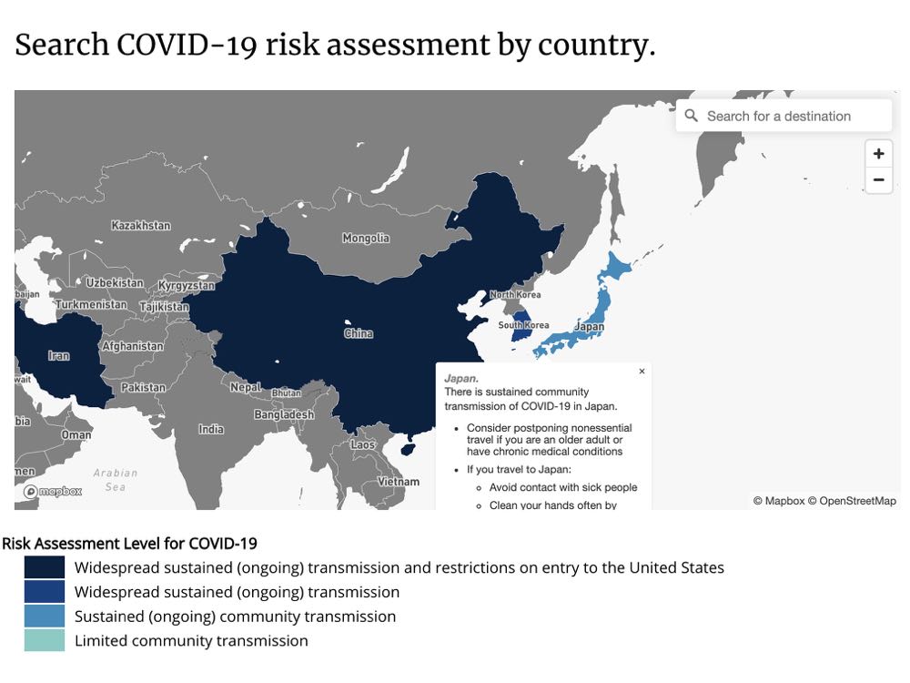 美國的 CDC 則是再用顏色分為「廣泛、持續的社區傳播,並禁止入境美國」、「廣泛、持續的社區傳播」、「持續的社區傳播」、「有限的社區傳播」四級,其中中國與伊朗民眾更是禁止進入美國本土。