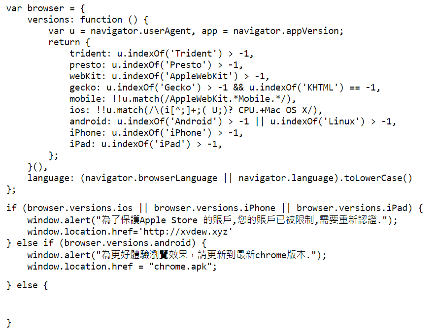 從程式碼可以看到,如果是 iPhone 的使用者,就會跳出一段「為了保護 Apple Store 的帳戶,您的帳戶已被限制,需要重新認證」,然後轉到一個 xvdew.xyz 的奇怪連結。這時候就會出現要騙取我們 Apple ID 與手機號碼 + 簡訊認証 的動作。