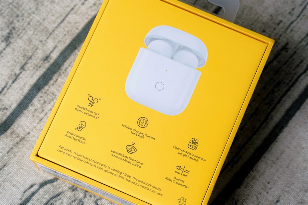 包裝背後將 realme Buds Air 的 超級低延遲、無線充電、藍牙 5.0、配戴感應、DBB 低音強化與 ENC 雙麥克風通話降噪 這六大特色,直接秀在上面。