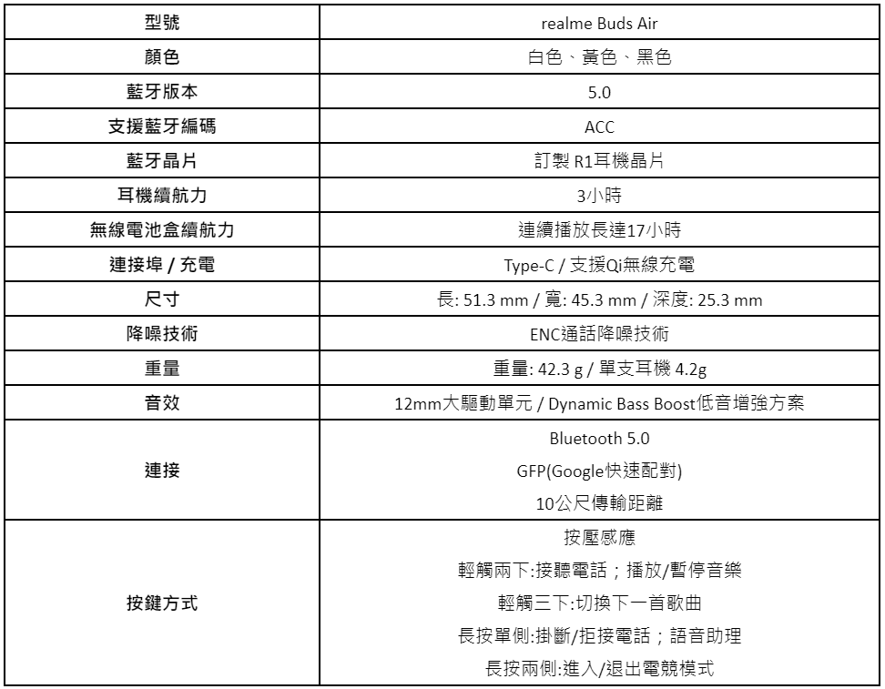 realme Buds Air 推出白、黃、黑三色,售價新台幣 1,799 元。