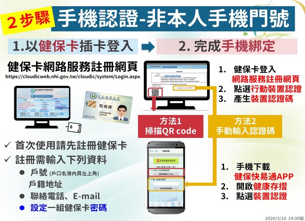 5) 如果還是沒辦法用手機來完成認證的朋友,就要帶著健保卡、身分證及戶口名簿前往健保署服務據點再使用電腦註冊來完成手機綁定。